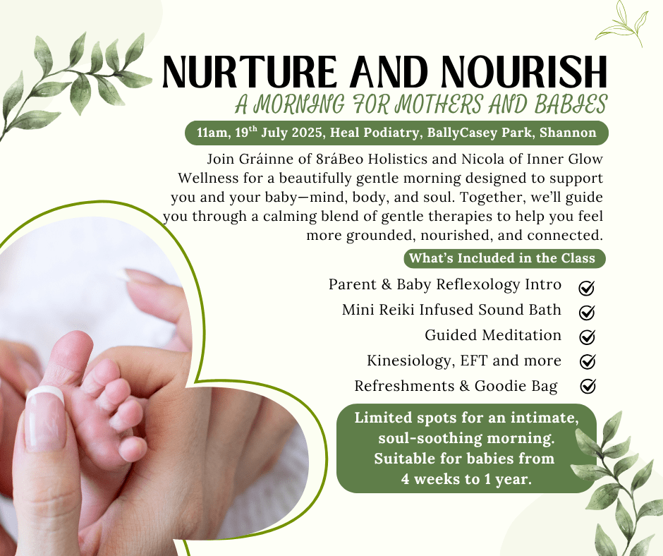 Join us in Lime Light Creative Arts, Oranmore (above Lidl) this August for 5 weeks to learn how to ease common baby discomforts like wind, colic, teething, and sleep struggles using gentle reflexology techniques you can use anytime, anywhere.